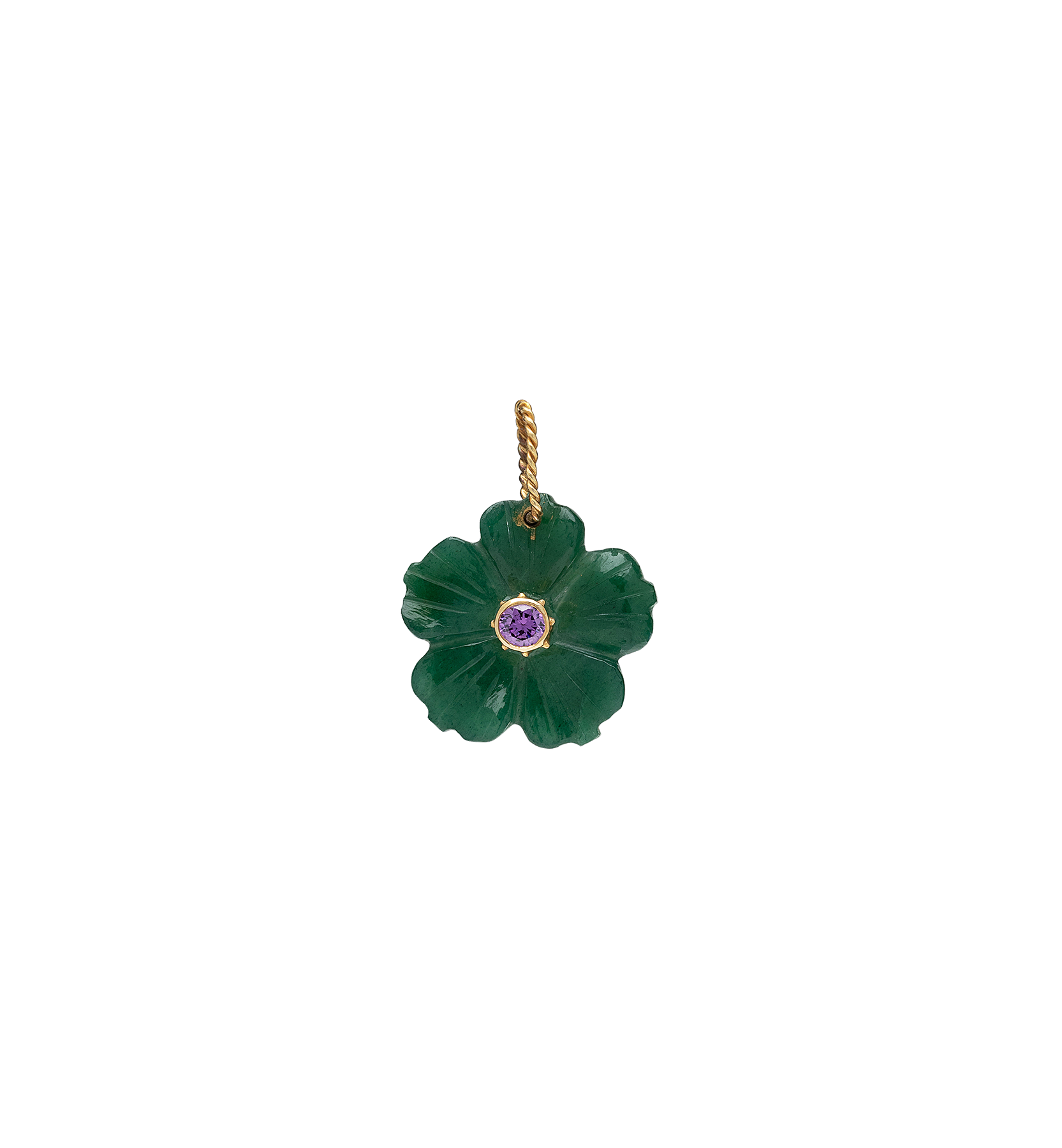 The Jade Garden Charm is a deep green flower crafted from natural green jade, finished with a warm, sparkling amethyst gemstone at its centre. The perfect addition to your favourite necklace.
