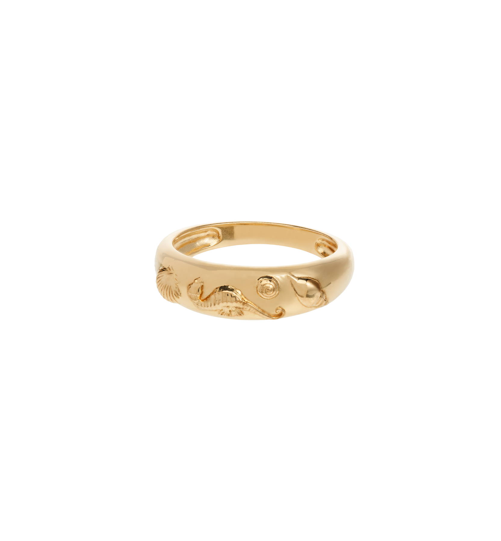 The Sable Ring is a beautiful piece with a unique design. The ring features summery elements such as a seahorse and shells. Pair the ring with other items for the perfect match.