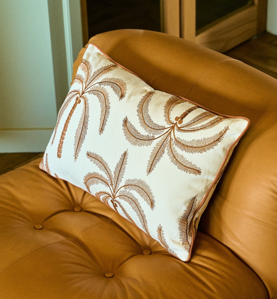 The California Palms Cushion is a tropical-inspired decorative cushion that instantly brings a summer atmosphere into your home. With a playful palm tree design and warm, natural tones, this cushion is a real eye-catcher on your sofa or bed. The perfect choice for those who love a casual, stylish atmosphere with a touch of paradise.