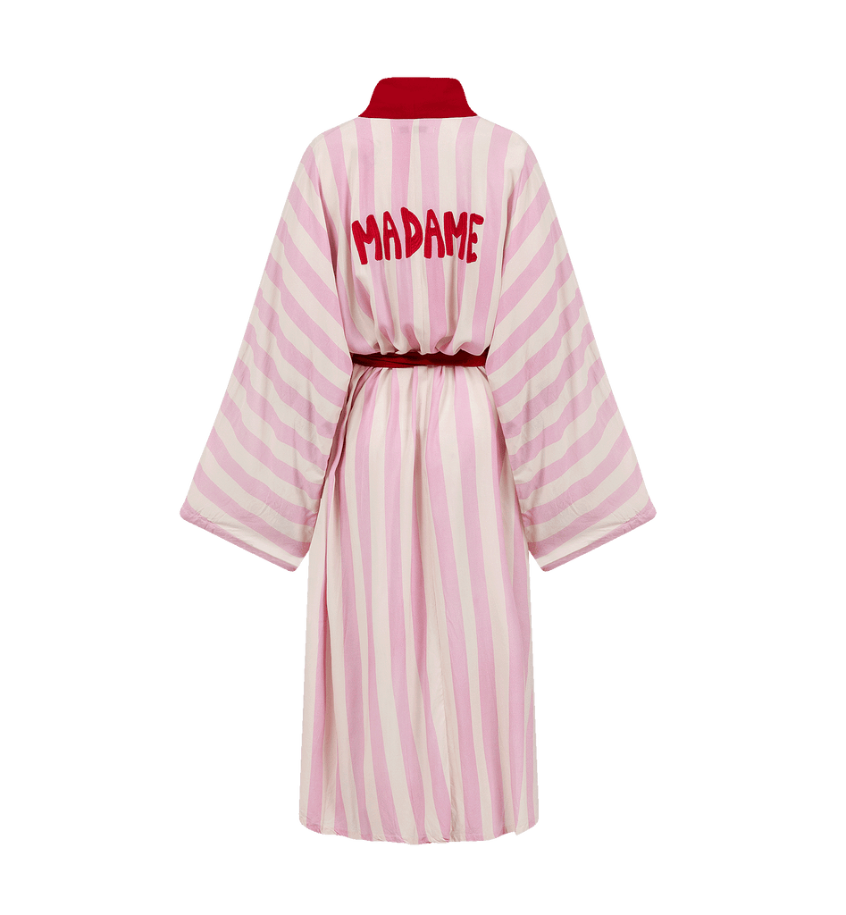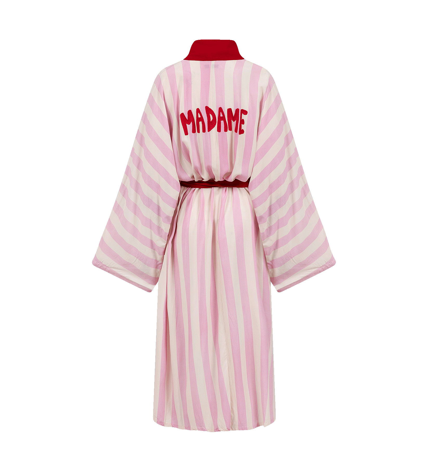 The Madame Long Kimono is your summer must-have! This kimono is versatile enough to pair with an evening outfit or wear casually on the beach as a cover-up; the possibilities are endless! The kimono is made from 100% rayon with embroidered letters on the back.