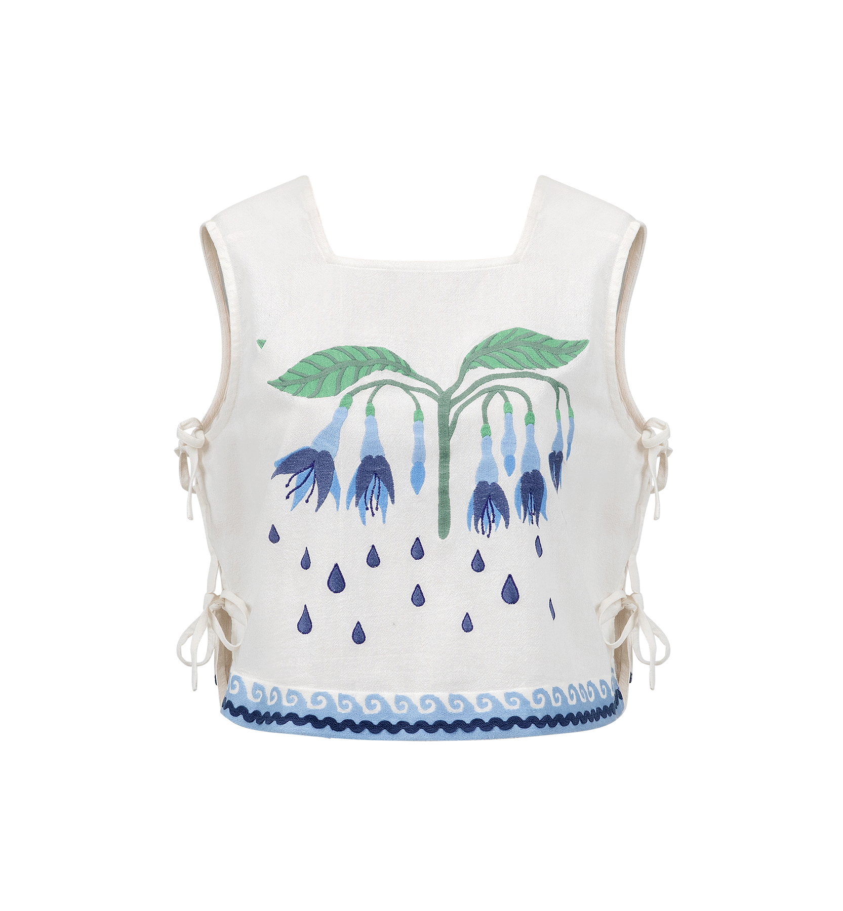 The Embroidered Indigo Flora Top is a playful item that immediately catches the eye. The front features refined embroidery of hanging flowers and falling drops in soft blue tones. The tie closures on the sides add a charming and adjustable detail. Pair it with the Embroidered Indigo Flora Shorts for a summery look.