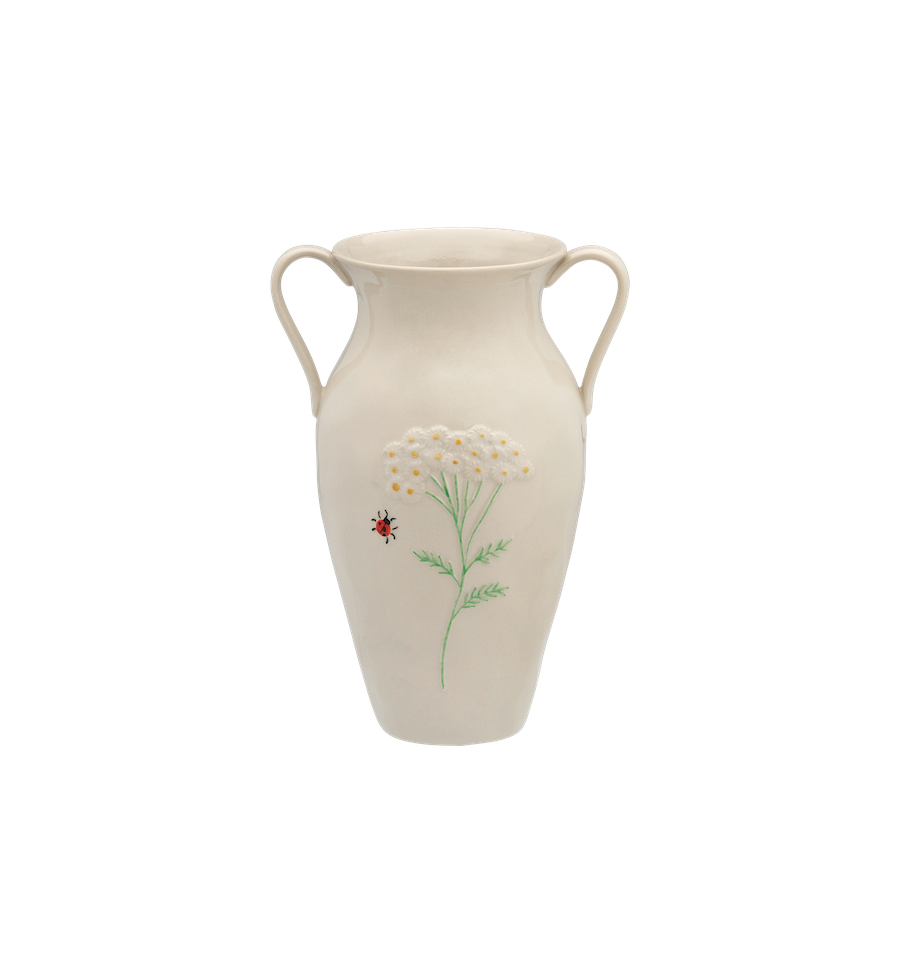 The Golden Dawn Vase is an elegant ceramic showpiece with a nostalgic look. The vase is decorated with a floral design and a cute ladybird. Perfect for a summer bouquet or as a decorative detail in your interior.