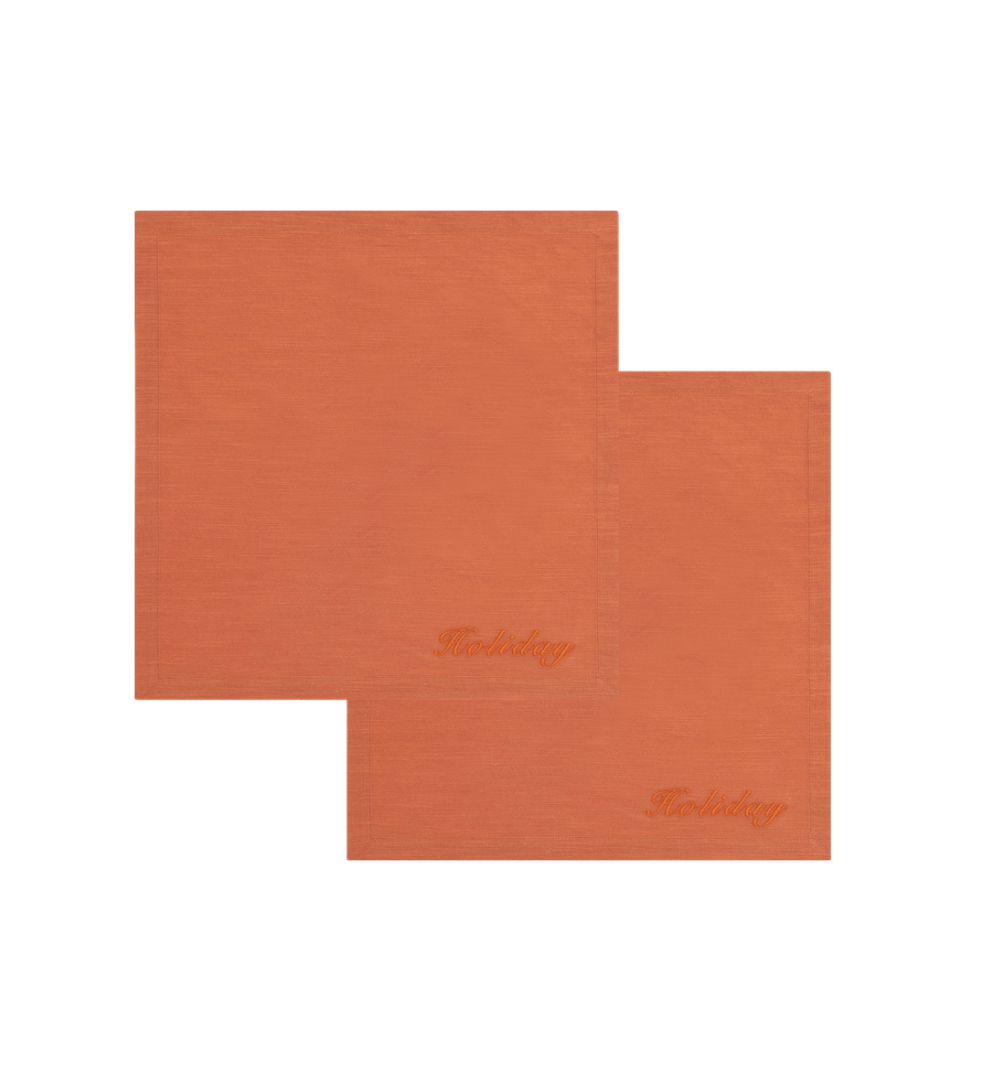 The Holiday Napkin Set of 2 has a warm orange colour and is made of organic cotton. Each napkin has a delicate Holiday detail embroidered in the corner. This is the perfect item to complete your summer table setting.