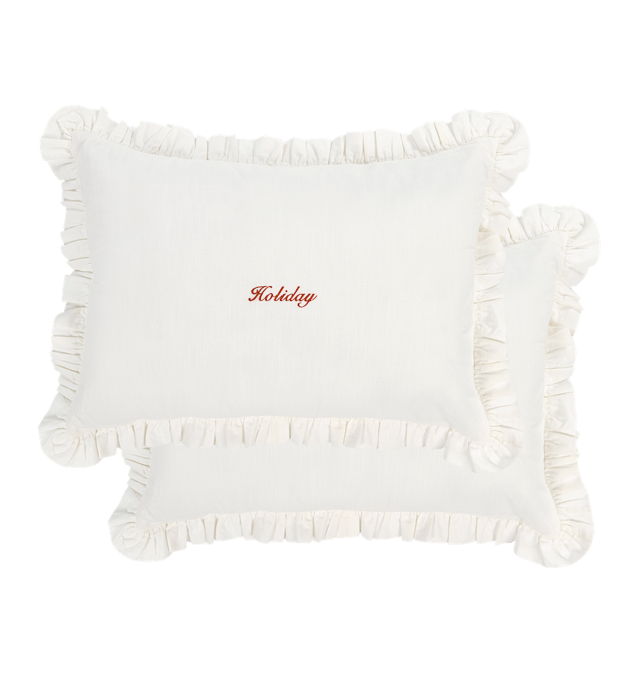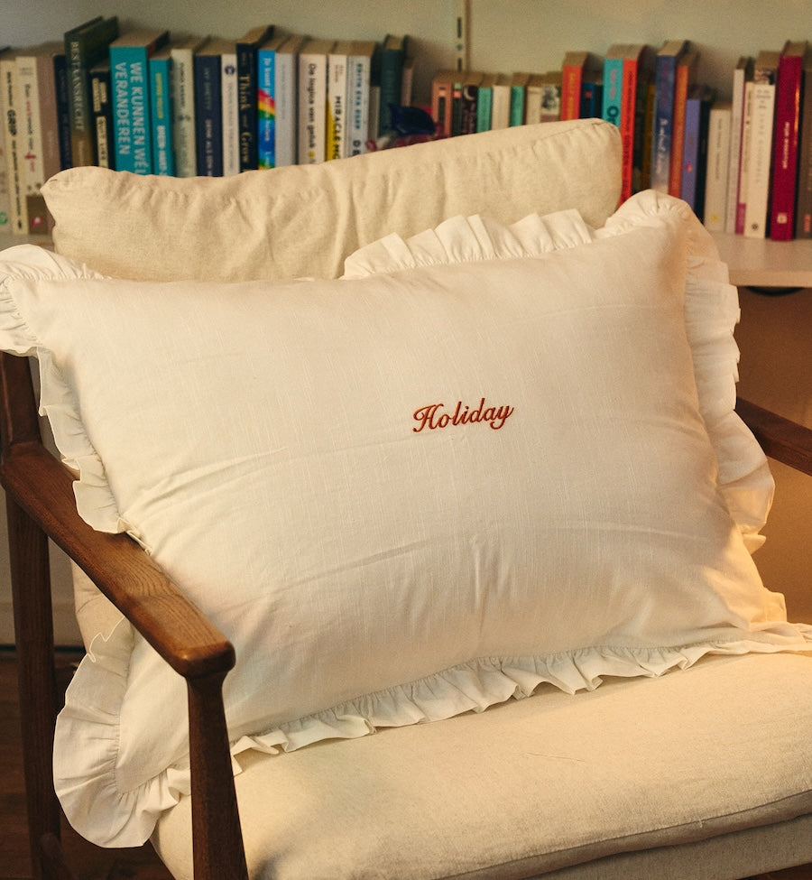 The Holiday Pillow Cover Set of 2 is a cute pillow set, perfect for summer. The pillow has Holiday embroidered in the centre and a cute ruffled border. This pillow will take you directly into summer atmospheres, whether you're on holiday or just relaxing in your backyard.