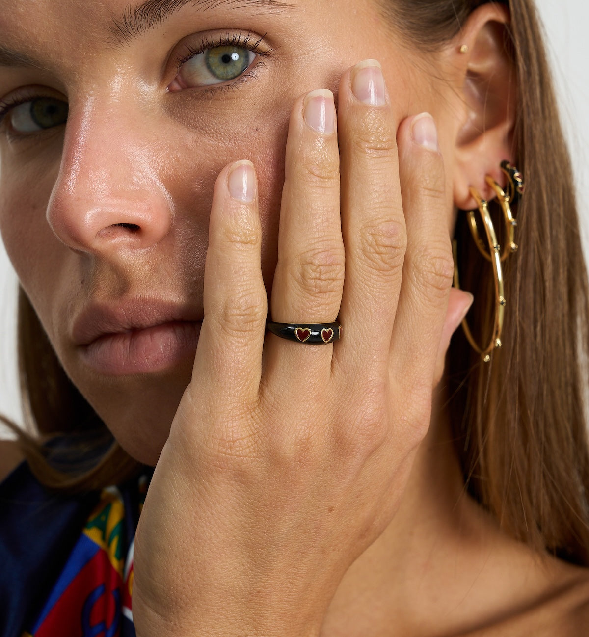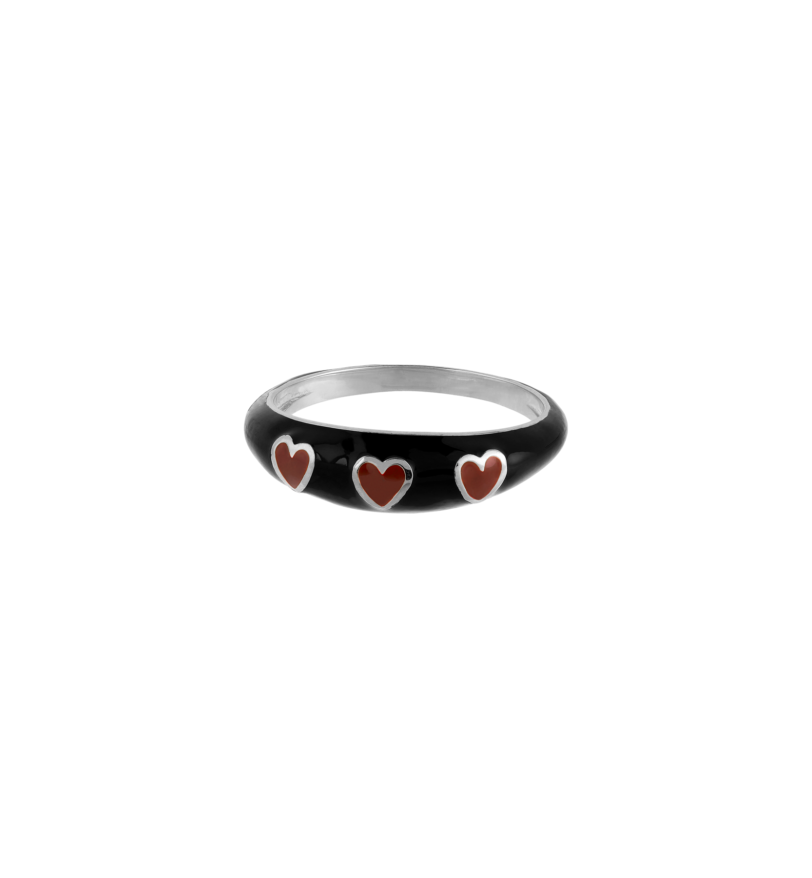 De Queen of Hearts Ring voegt een vleugje romantiek toe aan je look. Dit item heeft een diepe zwarte basis van enamel, versierd met speelse rode hartjes. Het subtiele contrast van kleuren en de details maken deze ring een perfecte keuze voor elke gelegenheid.