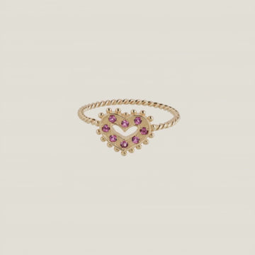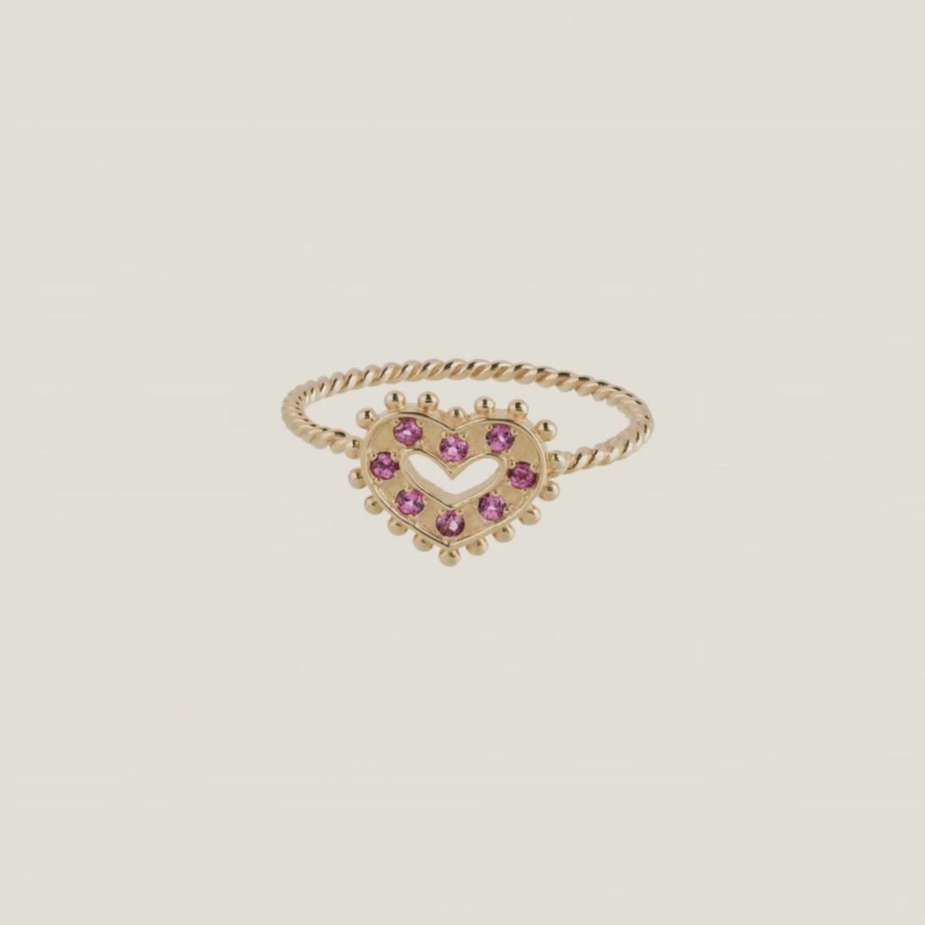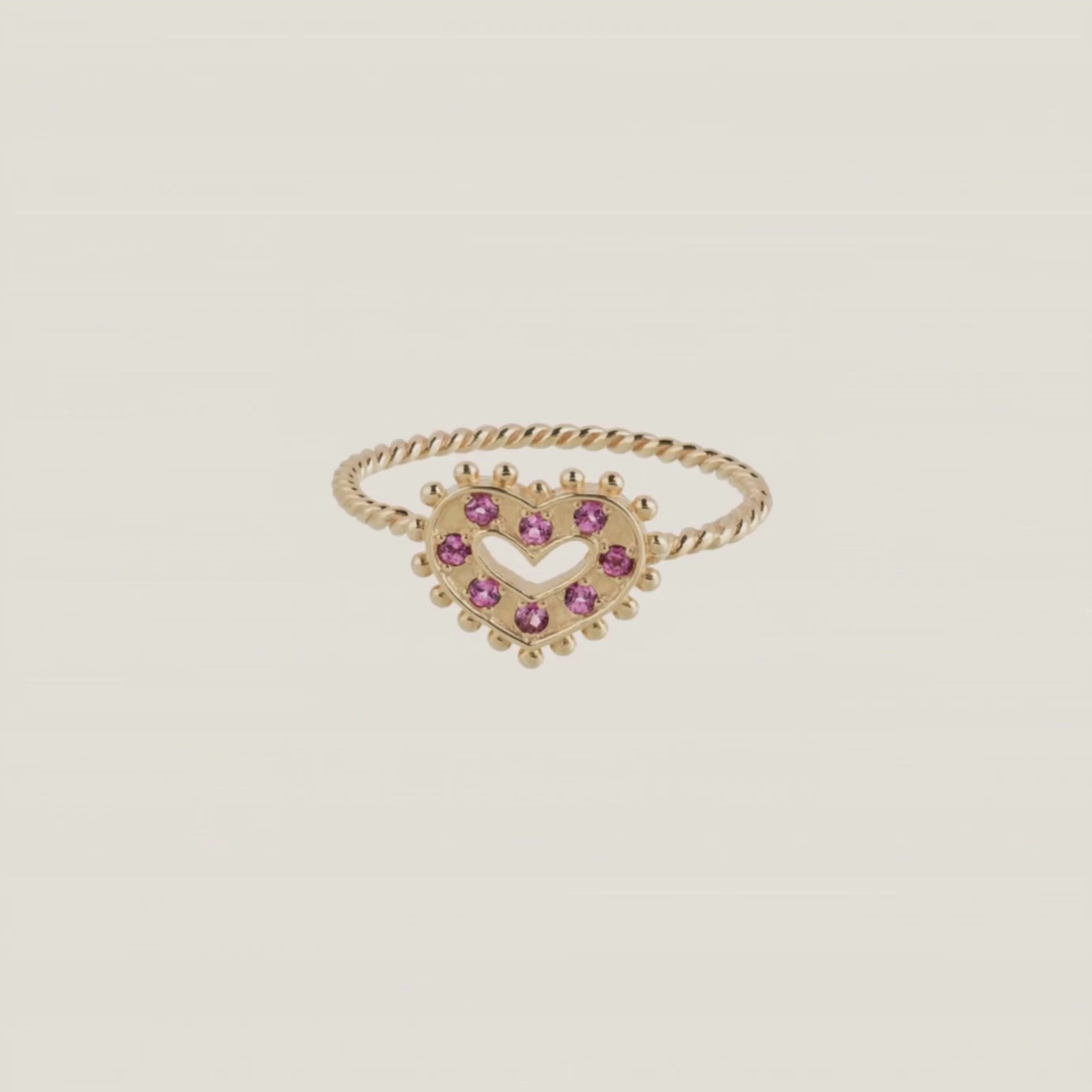 De Gilded Romance Ring 14K is gemaakt van 14K gerecycled goud, wat het een prachtig en duurzaam item maakt. De ring heeft een gedraaide band wat het een mooi detail geeft. De rhodoliet edelstenen in het hart maken de ring uniek en leuk te combineren met je andere sieraden.
