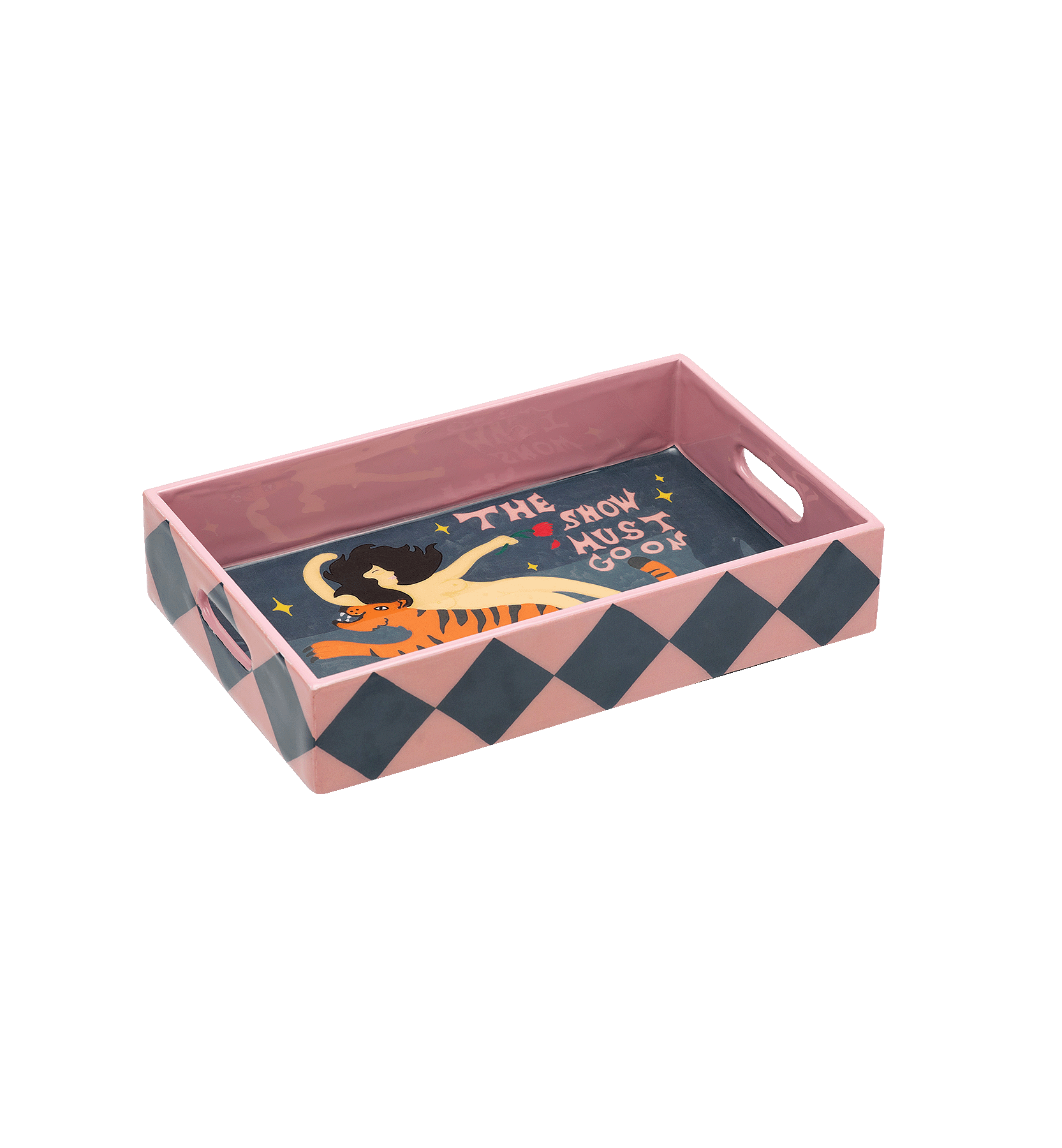 De The Show Must Go On Tray is een prachtig stuk dat je interieur nog leuker zal maken. Het dienblad heeft een vierkant ontwerp met de mooiste blauw en roze geruitte rand met een speelse opdruk in het midden. Zet je favoriete kaarsen of boeken op dit prachtige exemplaar.