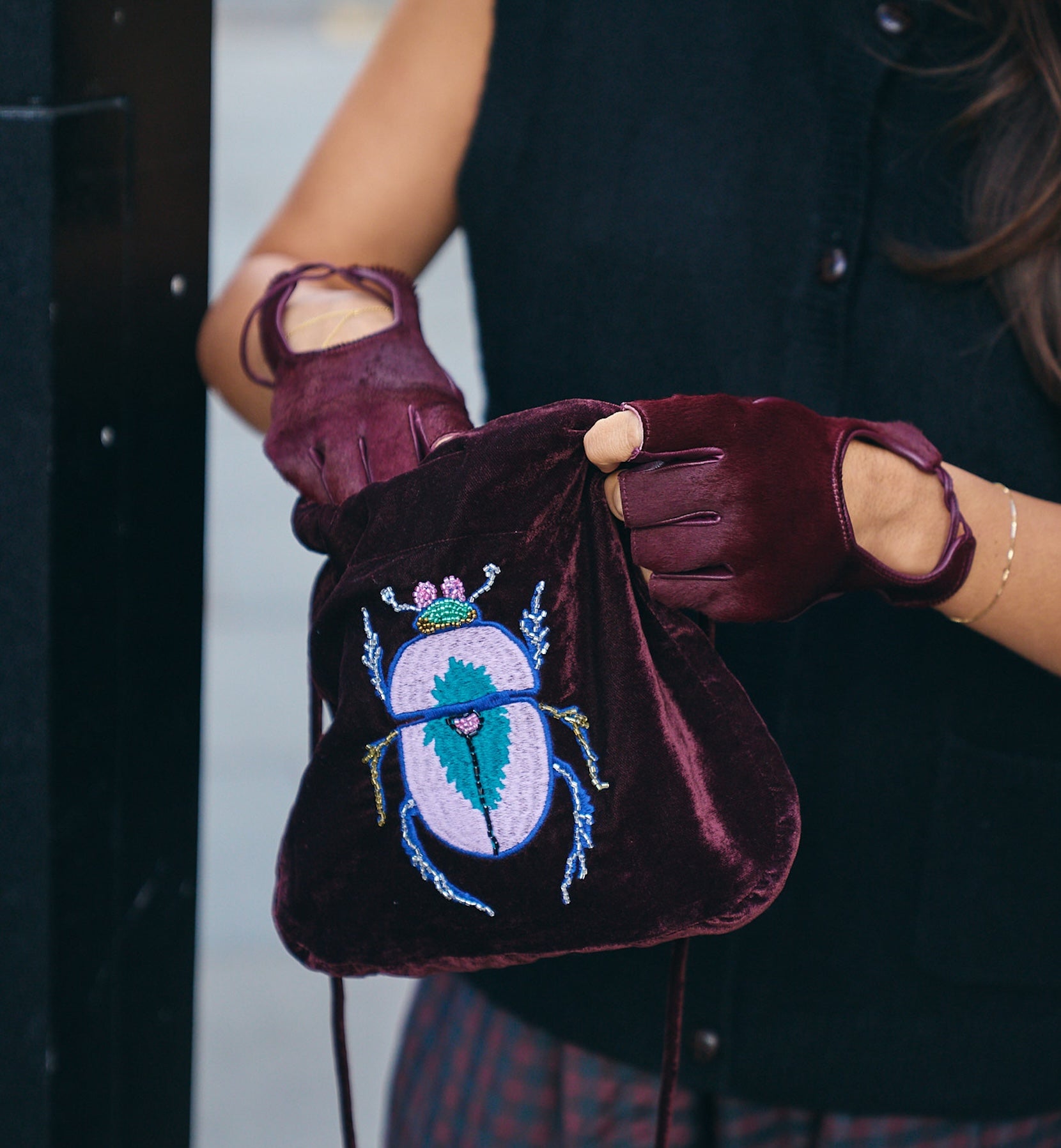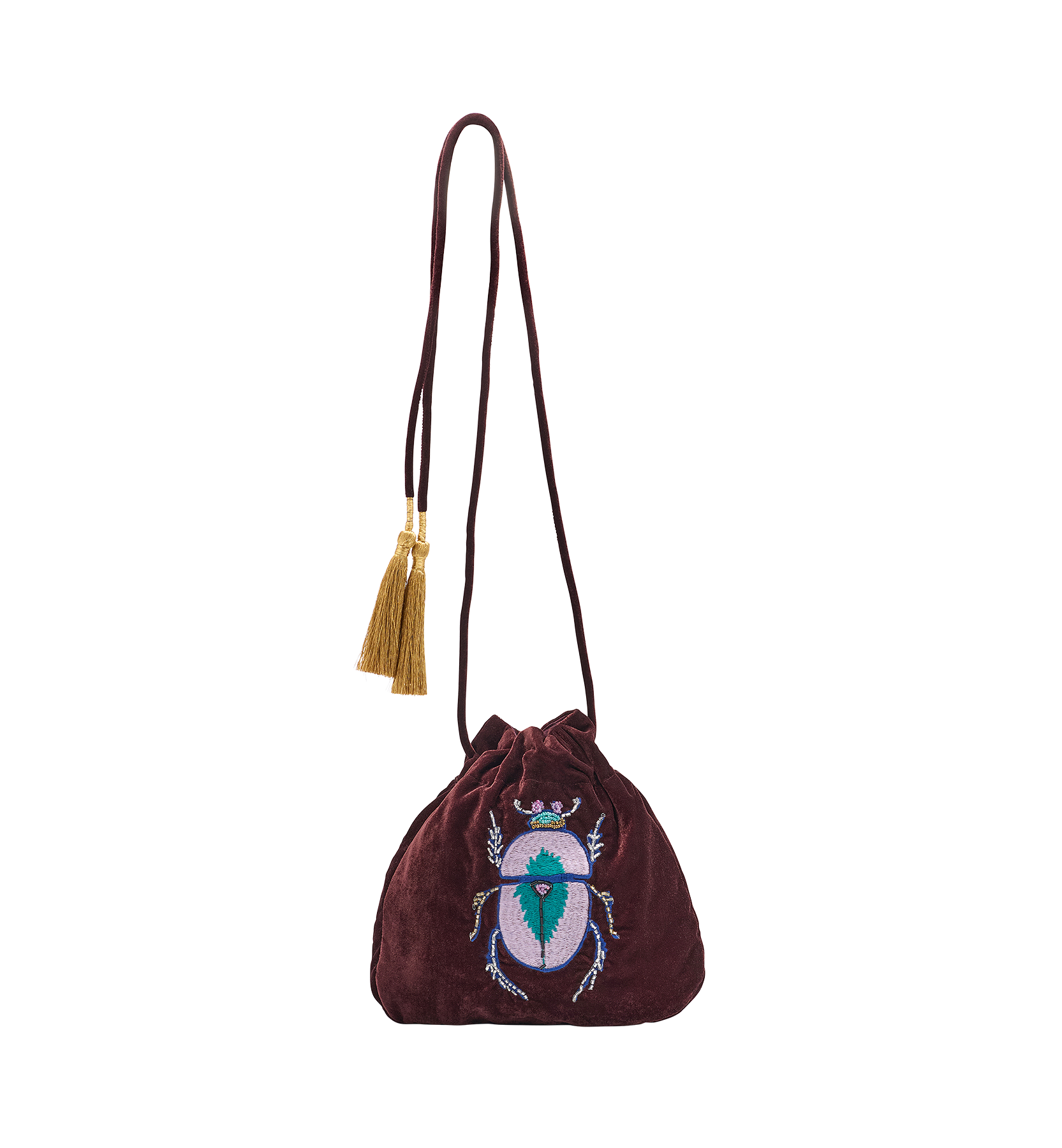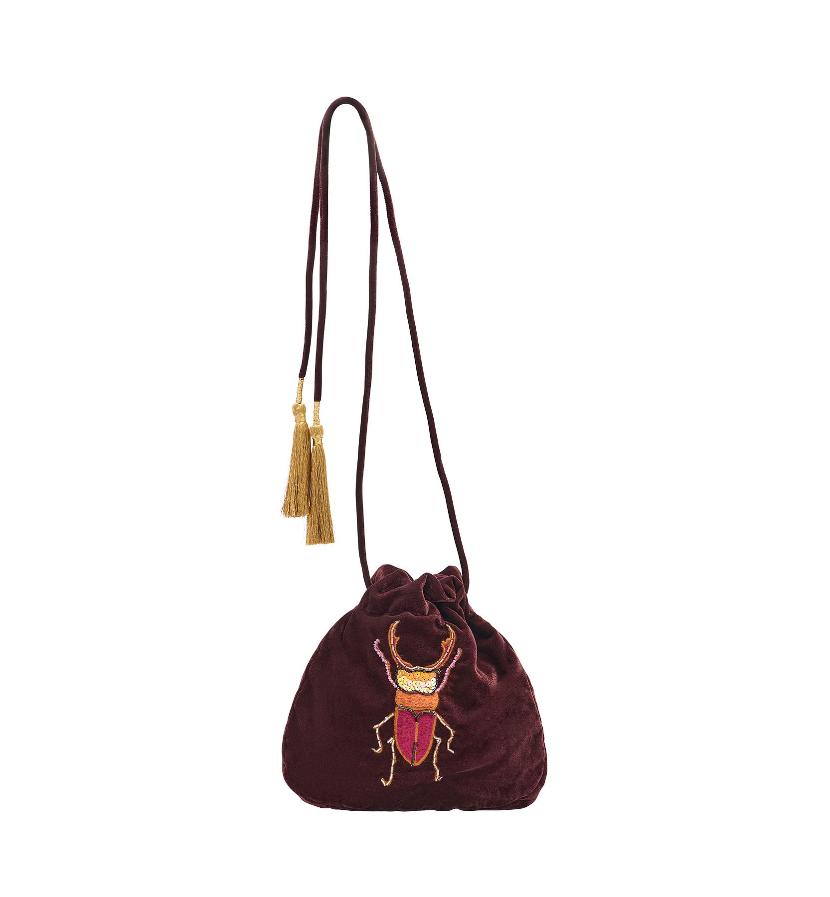 De Amber Beetle Bag is een excentriek statement piece. Met de hand geborduurd en versierd, geïnspireerd op mysterieuze Engelse tuininsecten. De gouden kwast en verstelbare strap maken dit accessoire zowel praktisch als onweerstaanbaar stijlvol.