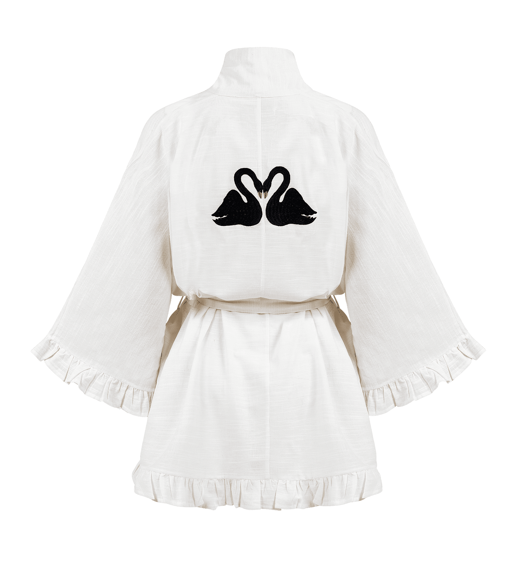 De Black Swan Kimono is een heerlijk item gemaakt van 100% organisch katoen. De kimono heeft twee prachtige zwanen op de rug geborduurd die samen een hart vormen. Begin de donkere dagen heerlijk in deze kimono.