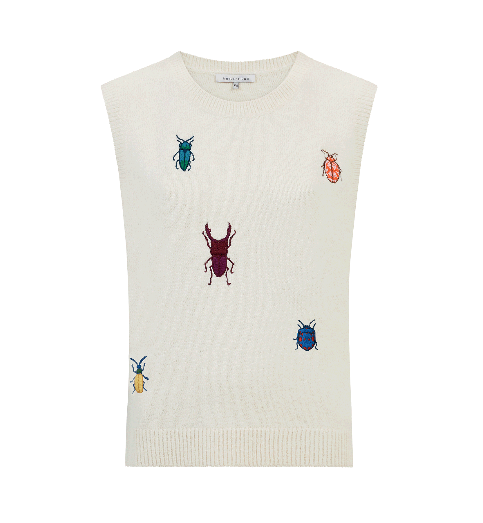 De Bugging You Vest is perfect om je warm te houden tijdens de koudere dagen. Het vest is versierd met vijf geborduurde insecten in levendige kleuren, geïnspireerd op de charme van Engelse tuinen. Draag het vest over een leuke blouse of op zichzelf met pumps voor een opvallende outfit!