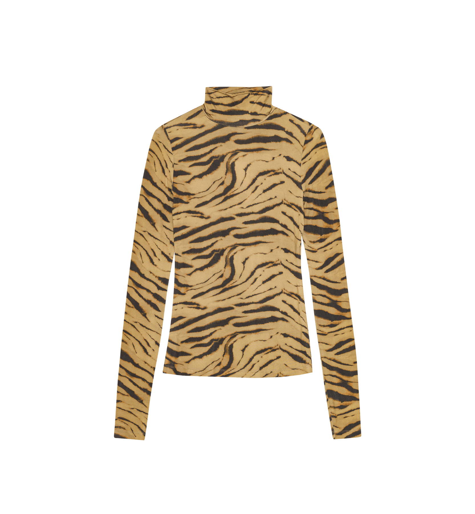 De GANNI Printed Shiny Jersey Turtleneck heeft een glanzende tijgerprint en stretchy viscosemix waardoor hij net zo lekker voelt als hij eruitziet. Draag hem als statement met je favoriete jeans of onder een blazer voor een speels detail.