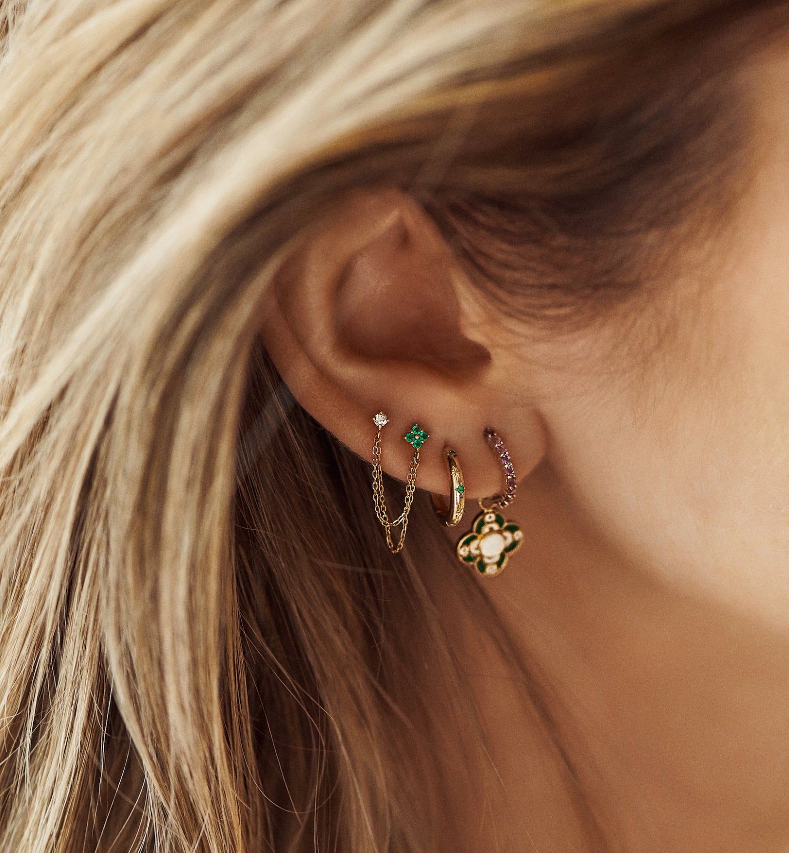 De Single Enchanted Chain Stud Earring 14K is gemaakt van 14K goud en heeft twee studs die verbonden zijn met twee fijne gouden kettinkjes. Het ene knopje heeft de vorm van een bloem en is bezet met vier groene chalcedoon edelstenen. Het andere knopje is een kleine glinsterende diamant. De kleur van de edelstenen in combinatie met de gouden ketting geeft de oorbel een bijzonder luxe uitstraling.