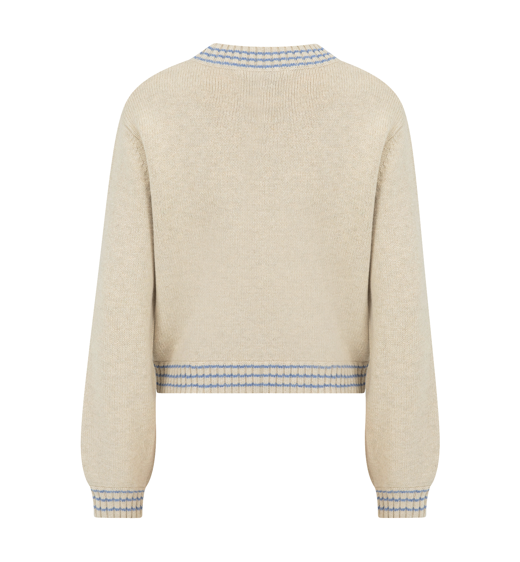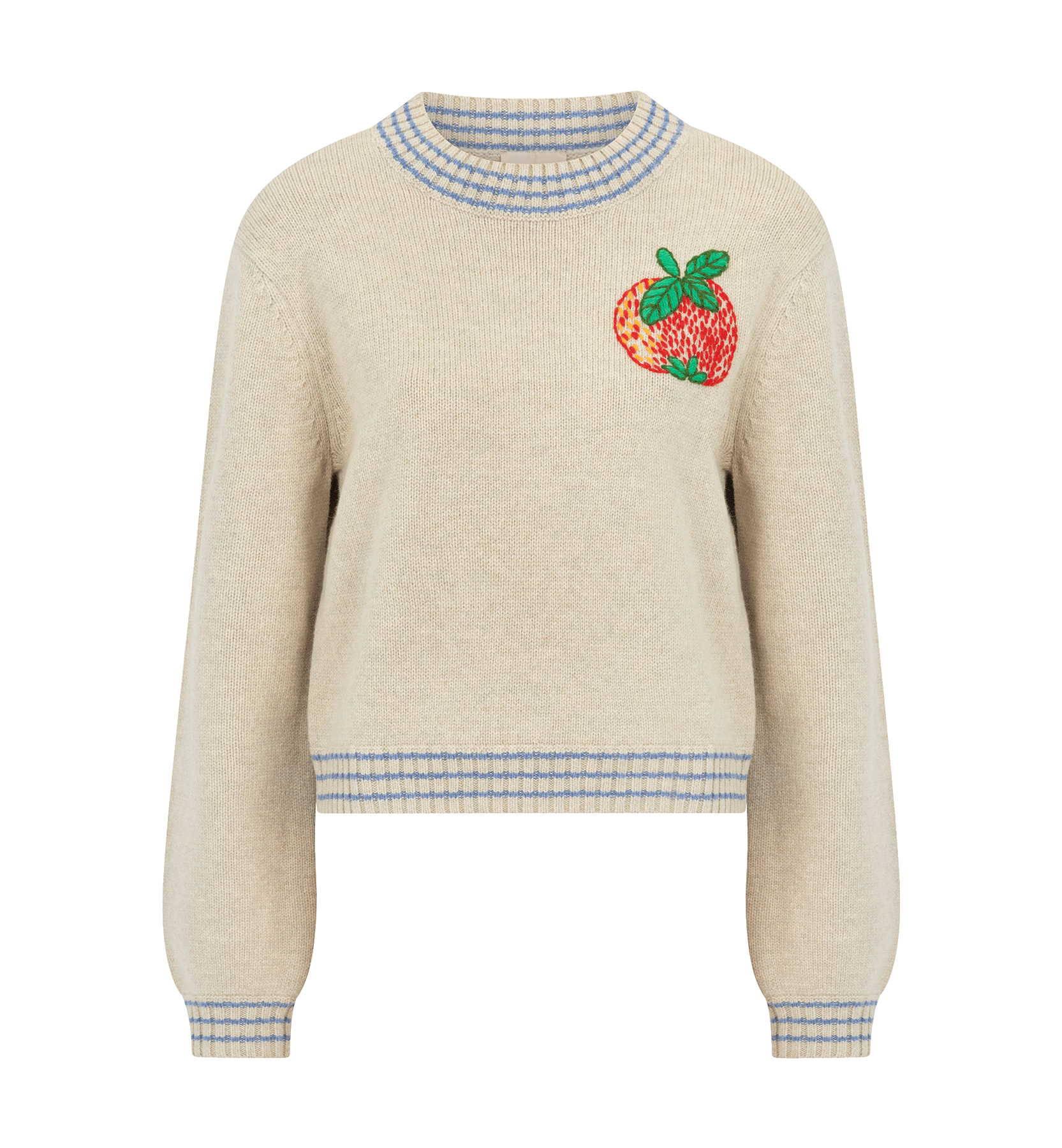 De Stella Nova Embroidered Apple Sweater is een speelse en tegelijkertijd verfijnde knit, gemaakt van een zachte wolmix. De trui heeft geribde boorden in contrasterende kleuren en het detail van een geborduurde appel. De combinatie van het warme beige met subtiele details maakt deze trui perfect voor het najaar.