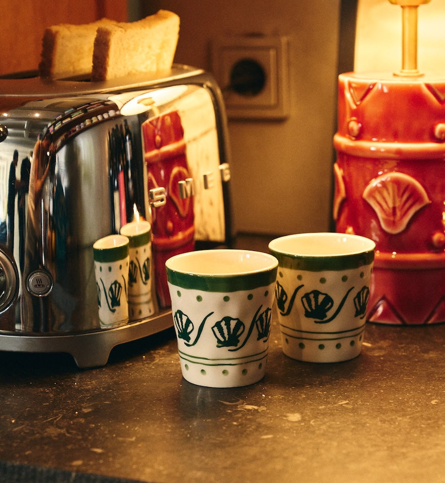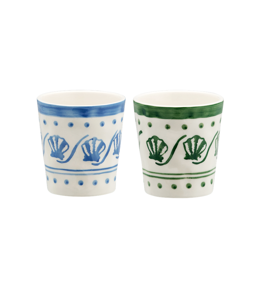 The Coastal Charm Coffee Cup Set of 2 takes you to the summer coastline. The set consists of two ceramic mugs, one in sea green and one in deep ocean blue, both decorated with subtle, playful details reminiscent of the beach. Perfect for your morning coffee or a quiet moment with tea.