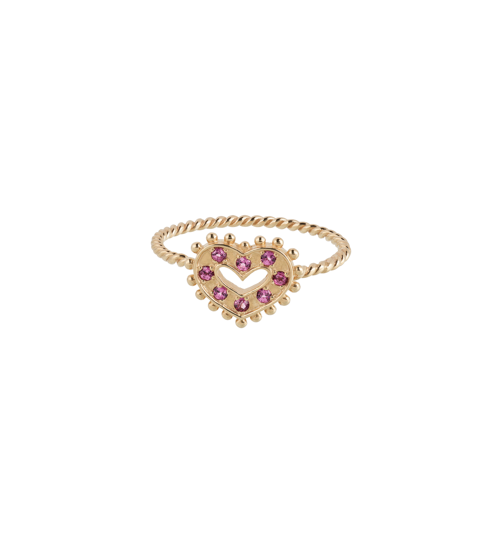 The Gilded Romance Ring 14K is made of 14K recycled gold, making it a beautiful and durable item. The ring has a twisted band which gives it a beautiful detail. The rhodolite gemstones in the heart make the ring unique and cute to combine with your other jewellery.