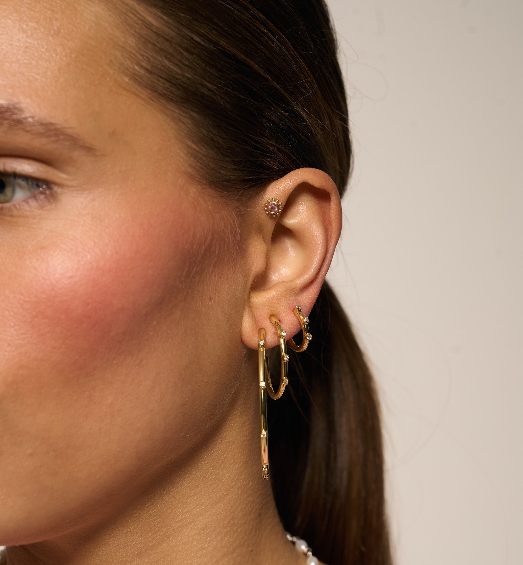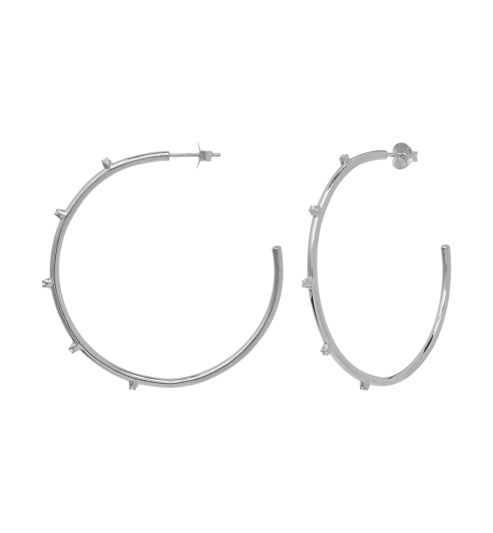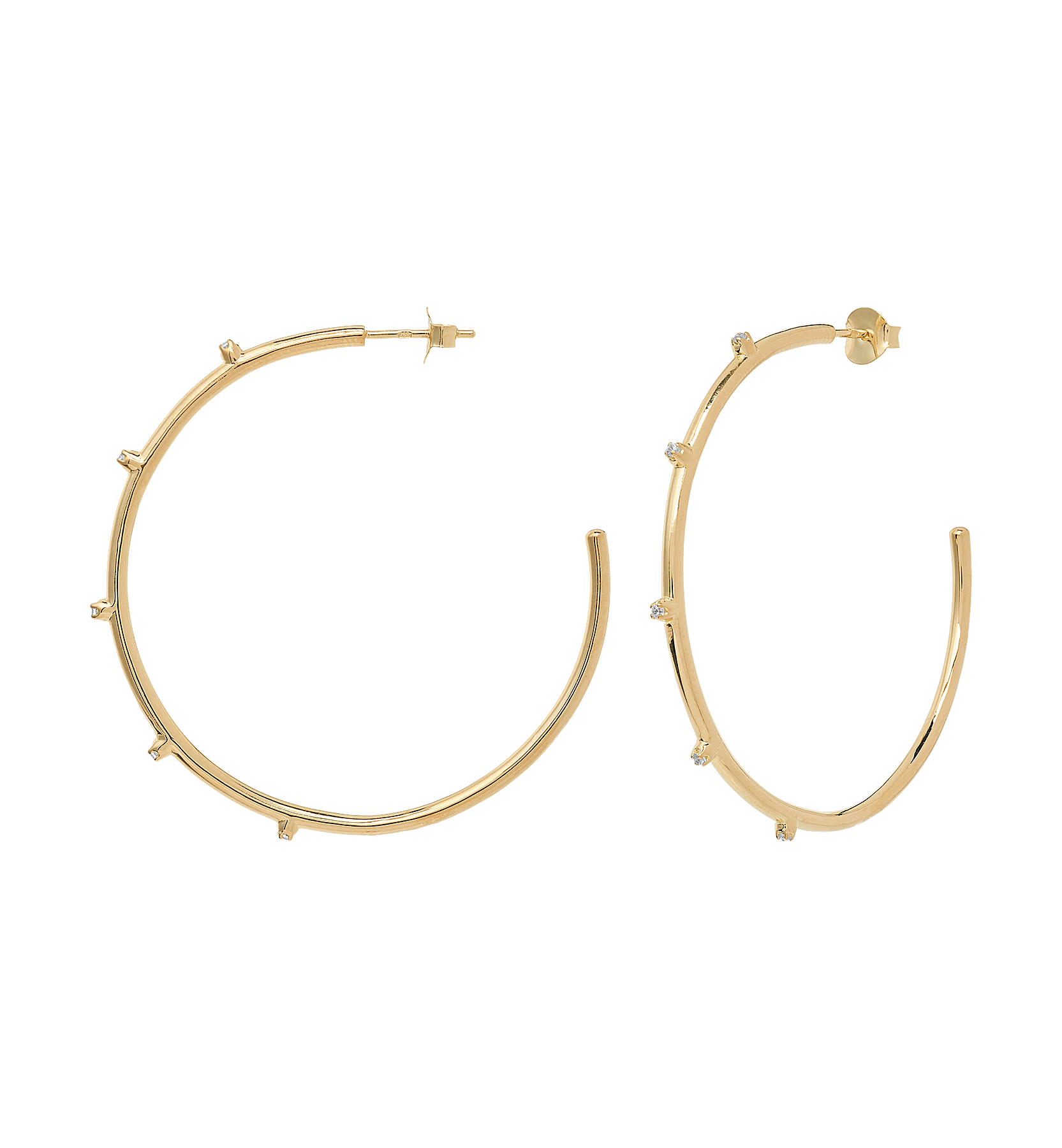 The Large Lumière Hoop Earrings are basic earrings with charming detail. The five Zirconia stones give the earring a playful twist. Wear this item for a night out or with a casual outfit.