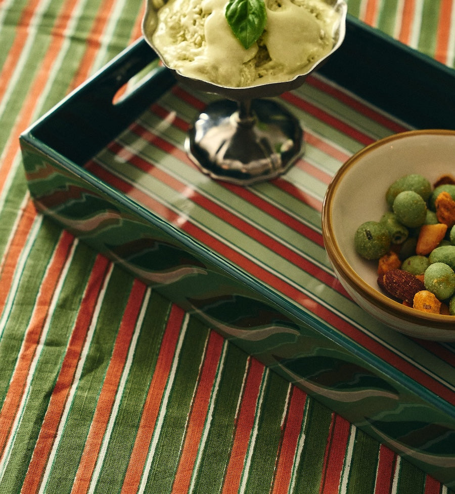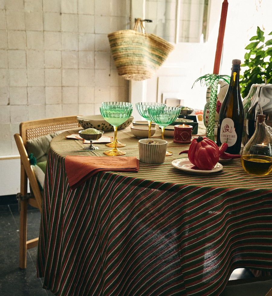 The Sicilian Sunset Tablecloth brings the feeling of a lovely summer evening to your table. This item is made of 100% organic cotton and features a colourful pattern. Perfect for long dinners or a sunny brunch in the garden.